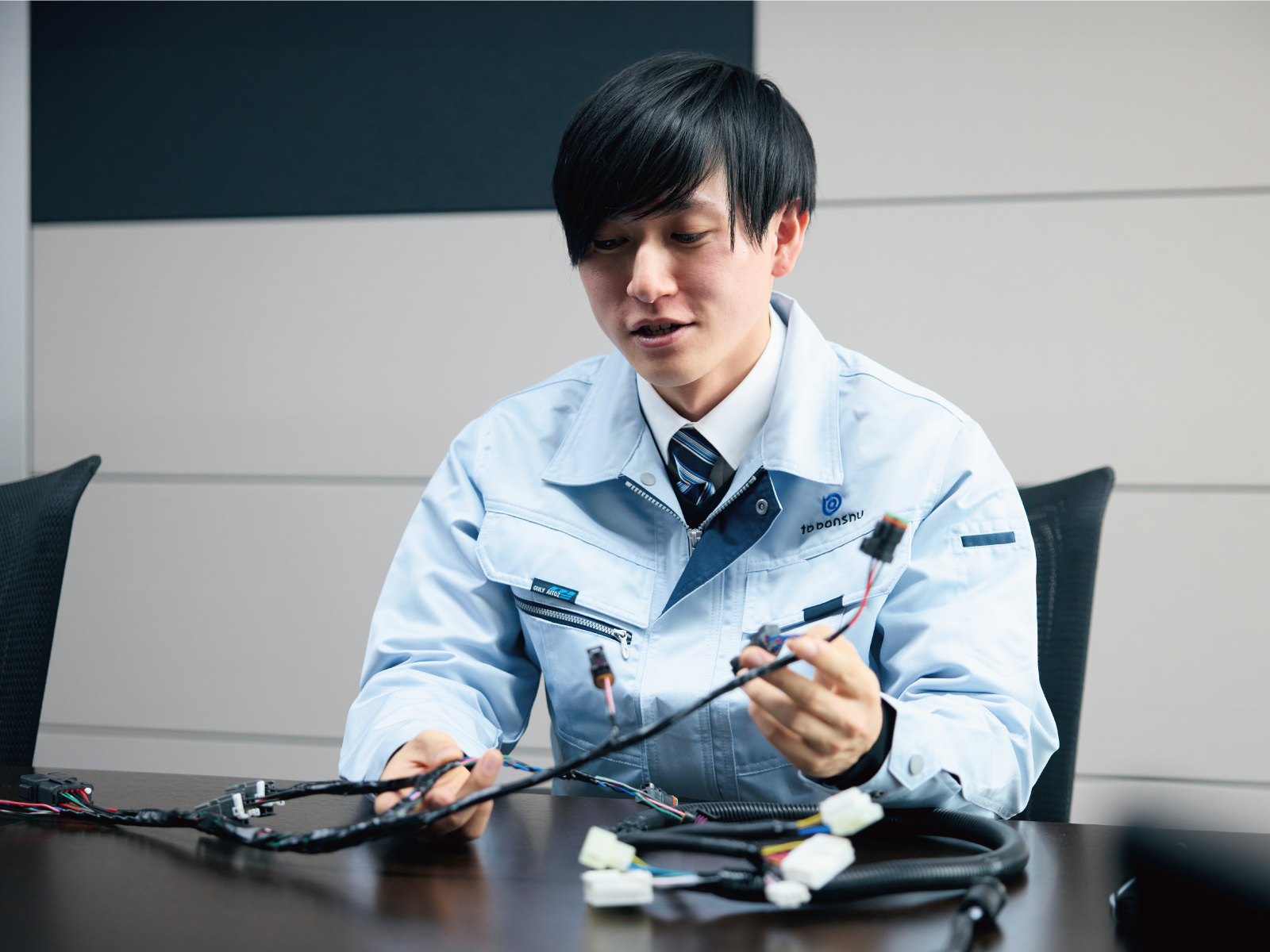 TB播州電装が製造・販売しているのは、建設機械や二輪車のワイヤーハーネス。ワイヤーハーネスとは、電子信号を送る電線やコネクタを組み合わせた電装部品で、人間に例えるなら身体を動かす神経とも言える重要なものです。私が営業職として担当しているのは、建設機械メーカー。ショベルカーやブルドーザーといった巨大な建設機械の中には無数のワイヤーハーネスが張り巡らせている。そんな一点一点をお客様が求めるスペックの仕様書をもとに提案し、受注獲得に向けて動いています。現在は10社近くを担当し、全国のお客様先にも提案に出向く日々ですが、入社時は1、2社の担当から。製品に関する知識や提案方法など、先輩たちからたくさんの助言をいただきながら、無理なく少しずつ任されていきました。お客様から信頼と期待を寄せられる先輩たちの背中を追って、ここまでやってこれたと思います。